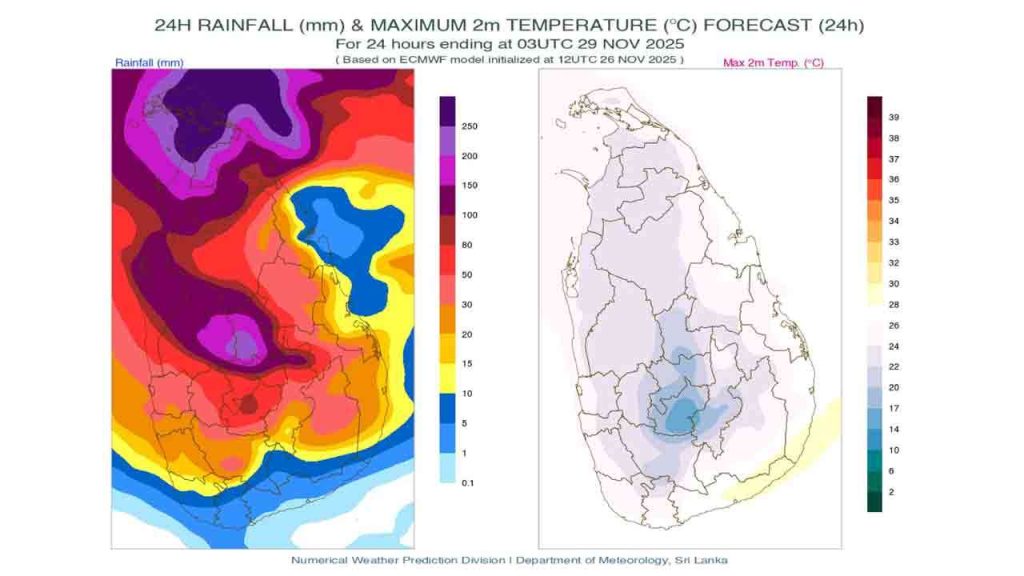 வடமத்திய மற்றும் வடமேல் மாகாணங்கள் மற்றும் திருகோணமலை மாவட்டத்தில் 200 மி.மீற்றருக்கும் அதிகமான மிக கனமழை பெய்யக்கூடும், வடக்கு, மத்திய, சப்ரகமுவ, ஊவா மற்றும் மேற்கு மாகாணங்கள் மற்றும் காலி, மாத்தறை மற்றும் மட்டக்களப்பு மாவட்டங்களில் 150 மி.மீற்றருக்கும் அதிகமான மழை பெய்யக்கூடும்.