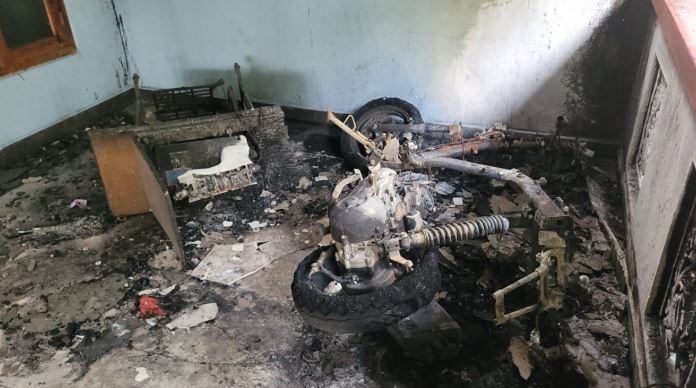 அதில் ஒரு வீடு தீ பற்றி முற்றாக எரிந்து நாசமாகியுள்ளது. வீட்டின் முன் நிறுத்தி வைக்கப்பட்டிருந்த பேருந்து மற்றும் மோட்டார் சைக்கிள் என்பவையும் தீக்கிரையாகியுள்ளது.